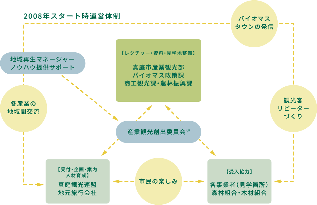 真庭地域は1993年頃から地元事業者のグループがバイオマスへの取り組みを始めていましたが、2005年以降、地球温暖化が話題となり、バイオマスという言葉が一般に浸透し始めると、市外からの視察が急増しました。市は事業者の受入れ負担を減らす事、観光への波及、バイオマスにより地域づくりの発信をすべてかなえる受け入れを考えました。