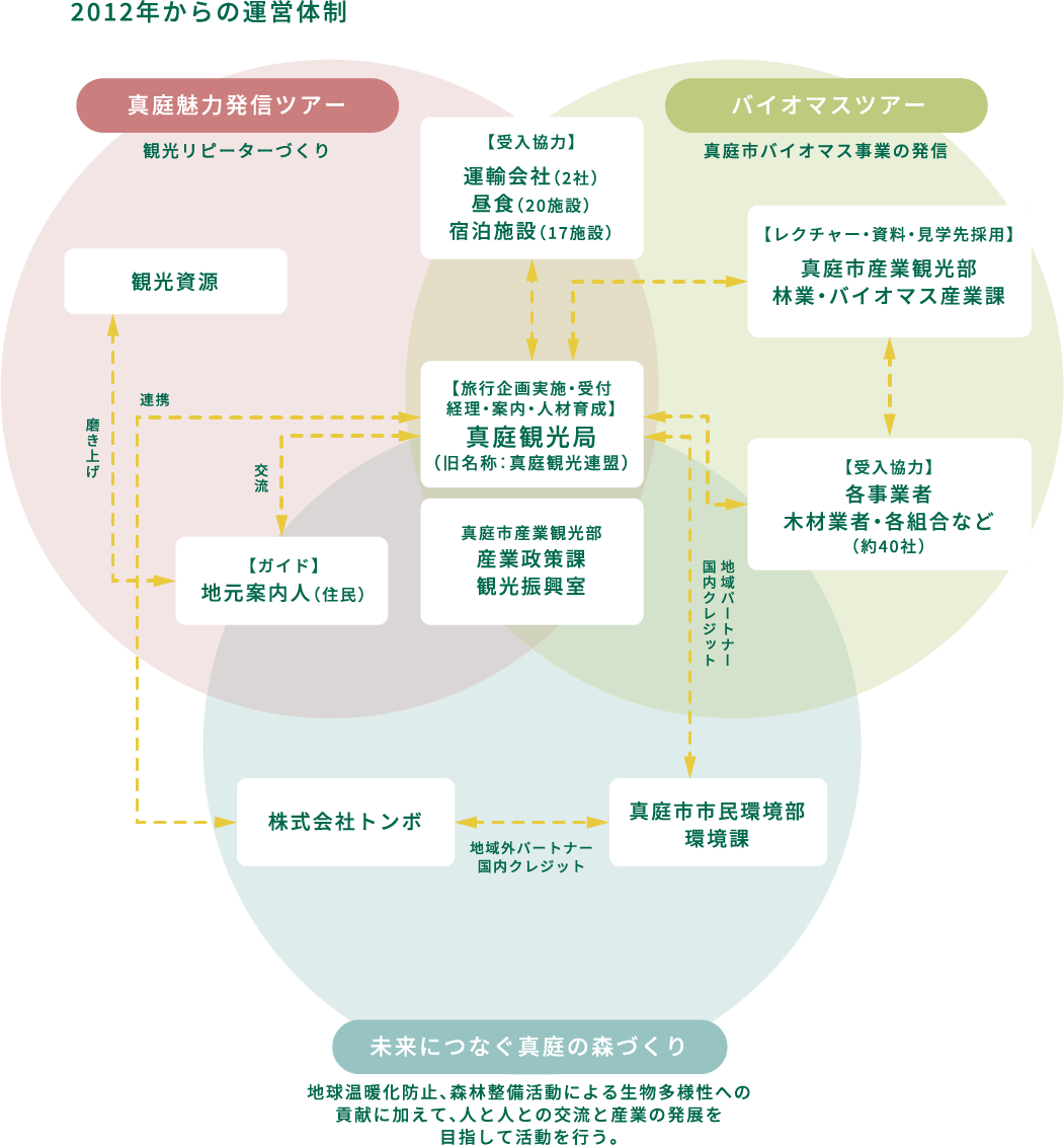 2009年からは、真庭観光連盟が運営母体となり、バイオマスタウン真庭の政策および関連事業者と連携し、ツアー運営を行っています。バイオマス事業者はもちろん、食事、宿泊、まちづくりの担当者たちも含めた関係者が地域活性化のために利害を超えた協力体制を築き、受け入れ態勢の向上に努め、現在では、年間約3,000人を受け入れるツアーとなりました。