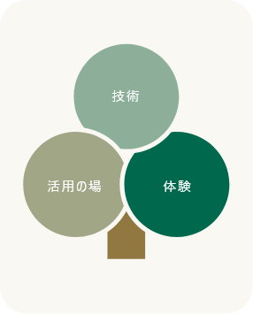 また、資源の中でも最も有望な木質資源を効率的に活用する技術を確立する事は、未来の人類の存続にもかかわる重大な課題と捉え、木質バイオマスを中心にそれ以外の資源も含め、技術と暮らしの輪が地域内で循環するモデルにも取り組んでいます。