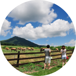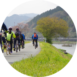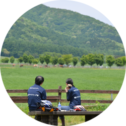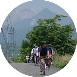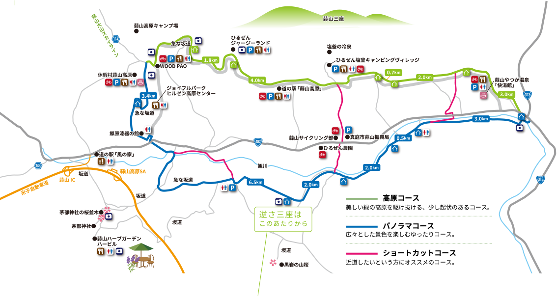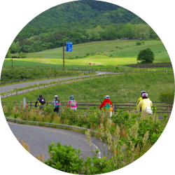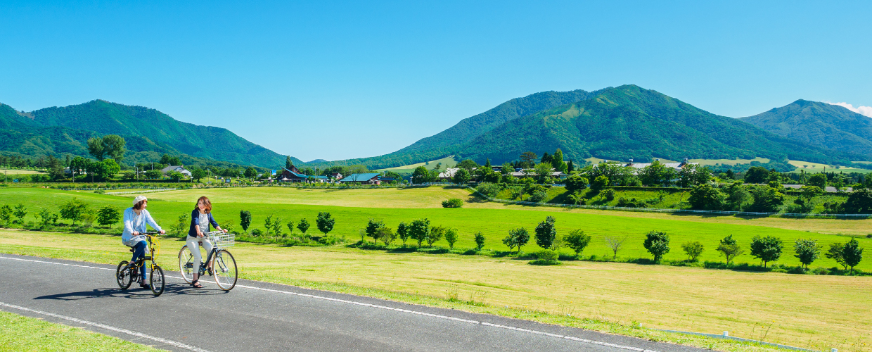 蒜山高原をぐるりと一周する約30kmのコースです。中国地方の最高峰「大山」を望む雄大な景観と牧草地や田園の広がるのどかな風景を一度に楽しむことができ、アップダウンも少なく初心者やお子さま連れの方などにも安心して楽しむことができます。コースの途中には多くの立ち寄りスポットが存在し、日常を忘れ、ゆったりのんびり過ごすことができます。