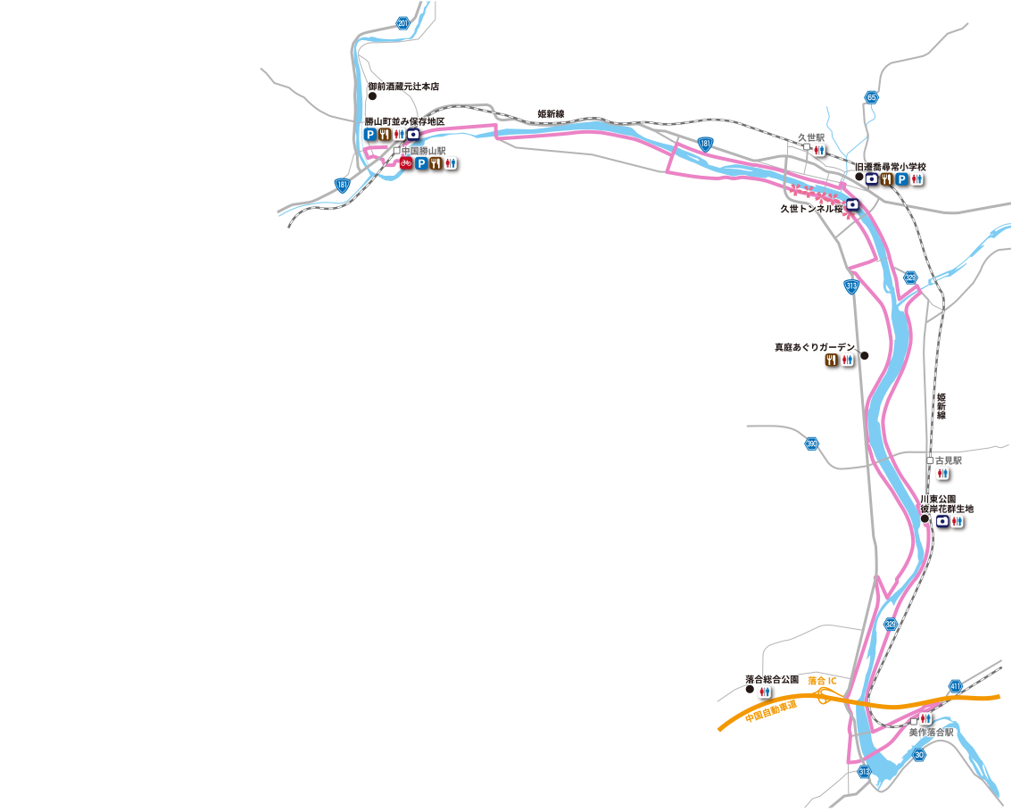 真庭市の旭川に沿って勝山・久世・落合エリアをめぐります。春には約1kmに渡る久世トンネル桜を爽快に駆け抜け、昔懐かしい町並みを