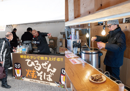 アツアツのひるぜん焼そば、しし汁、フライドポテト、フランクフルトやホットドリンク、ホットワイン、アルコールを用意しています!