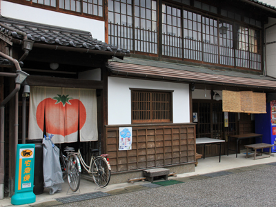This shop has been selling groceries and doing catering since 1920. Four years ago, the building was remodeled so the cook can talk to customers while they work in the kitchen. Fresh fried food, takikomi gohan (a rice dish), sushi and lunch boxes are served daily. Their noren has always featured vegetables, and their second and third ones have a bright, energetic tomato design. The owner also gives a bright and energetic greeting to everyone who passes by her shop. |