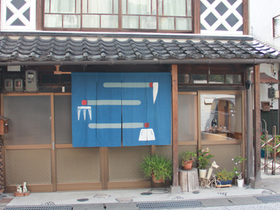 The design for this family's noren comes from the place where their company makes handles for hoes and spades. They also make metal handles for hammers and saws, drumsticks and so on. This is their second noren, featuring the same design as the first but in different colors. In the window next to their noren, they have a seasonal display for visitors to enjoy. The Nishiyama family, who moved to Katsuyama fore years ago, believe that "Katsuyama is a warm town where you can feel a spirit of mutual dialog and cooperation."