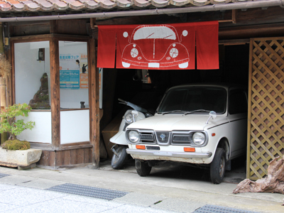 This company has two noren, the first of which features a design inspired by tire tracks. Their second noren's design is based on a Volkswagen Golf. The current owner loves classic cars, and the Golf is one of his favorites. Under the waving noren is a 1969 Subaru R2. They take such good care of this car that it can go for a drive even today. The only time the car is not on display is during the annual Katsuyama Hina Doll Festival. |