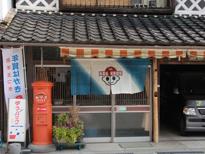 An old-fashioned red mailbox can be found in front of this house.The family's noren features the symbol of a postman which was familiar to their grandmother, since it was used for many years on postal zip code books. They changed the background color to blue this time. The zip code on the noren was not included at first, but their grandmother asked to have it.They still keep old-fashioned one to better match the classic style of the buildings around it.