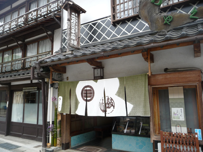 Their noren's design consists of the image of a servant in the daimyo's train (taken from the box used to hold their goods), as well as traditional Japanese sweets. |