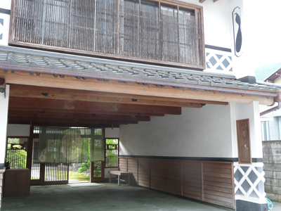 thin hemp cloth so the lattice door of the entrance and the beautiful garden within are not hidden from sight. Its design uses two gently overlapping circles. The gourd design on the lower left was taken from a design found on a traditional udatsu-style wall in the Miyata's house. |