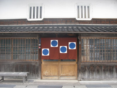 This is an old house with a long history. The design of its noren comes from the house and the tsurunoi "crane well" trademark that was created when the family ran a soy sauce factory and storehouse. A masu (a square wooden box used to measure rice) was designed in deep blue color on the noren this time. If you look at this house from the far bank of the Asahi River, you can see the big soy sauce storehouse. The soy sauce business was in the family for three generations. At that time, they also sold earthenware pots on a bare dirt floor.