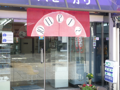 A noren with a clock face design waves in front of this store. The shopkeeper specifically requested the numbers be aligned with the center of the clock, rather than horizontal. They have light blue and peach norens, and decide which one to hang for the day based on the season and weather. Mrs. Hasegawa says "the charm of this town is that it's very easygoing, like a gentle noren. Because of this, it's very easy for people to interact and have conversations with each other."