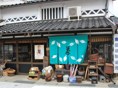 This gallery was founded in the Meiji era as a shop which dealt in tea, inkstones and Karatsu porcelain. Even though they handle many secondhand articles and antiques these days, their noren always features a tea-leaf because they have dealt in Uji tea leaves and powdered tea since the old days. Their previous noren featured a single huge green tea-leaf. But this noren (their fifth) has many little tea-leaves on a bright background, which calls to mind the image of green tea. |