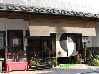 This shop began producing sweet bean jelly, yubeshi, rice crackers and candy around 1926. They make their saké-manju with the Gozenshu Mimasaka brand of saké produced by the Tsujimoto brewery of Katsuyama. They have requested a noren with a circle motif each time because it resembles a round manju. This time, their noren features a very Japanese design in black, red and white, resembling a crane or a geisha. |