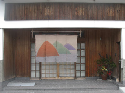 This noren features 3 mountains. Because the family operates a rock quarry in the mountains nearby, they requested this design. The family's noren is was made to resemble the mountains around Katsuyama: abundant green changing with the seasons. This noren expresses misty mountains changing from fall to winter. An arrangement of flowers can also be found with the noren in front of the house for visitors to enjoy.