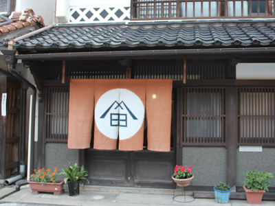 This house is known around town as "The Taga Shop" since it used to be a rice dealership in the old days. This name was found on a measuring box and wrapping cloth from that time and the family asked for a design based on this trademark. This is their fifth noren. Mrs. Toyota considers the many colors of the other noren waving in the neighborhood, and chooses a noren which will compliment their hues. Since the fame of the town's noren has spread through television and books, the family is often contacted unexpectedly by friends from far away. |
