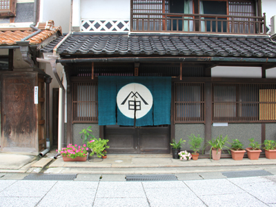 This house is known around town as "The Taga Shop" since it used to be a rice dealership in the old days. This name was found on a measuring box and wrapping cloth from that time and the family asked for a design based on this trademark. This is their fourth noren. Mrs. Toyota considers the many colors of the other noren waving in the neighborhood, and chooses a noren which will compliment their hues. Since the fame of the town's noren has spread through television and books, the family is often contacted unexpectedly by friends from far away. |
