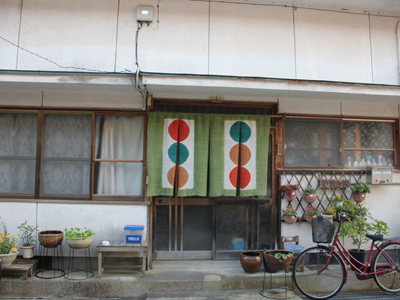 The three friendly circles on this family's current noren represent the lively, warm home made by their three sons. They requested colors that would match the color scheme of the annual Hina Doll Festival. Eighteen years have passed since the noren first began to wave in this town and this is their fifth noren. Another noren is patterned after the stone wall that runs the length of the Asahi River in Katsuyama. This time, the green color represents their three sons growing up surrounded by their kind family. They wanted a more vertical design, so the circles were arranged in two sets running top to bottom. |