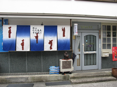 The Yasuko Hair Salon opened for business in 1961. Their noren features a design based on the Chiyomanzai-hounen, a traditional dance performed during Katsuyama's Bon Festival for the past 280 – 300 years. These days, the dance preservation committee holds it during the town's Autumn Leaves Festival as well. The silhouettes drawn on this noren express the sequence of the dance. The song, samisen, bamboo flute and drum all blend together with the slow movements of a dance which perfectly matches the comfortable pace of life in Katsuyama. |
