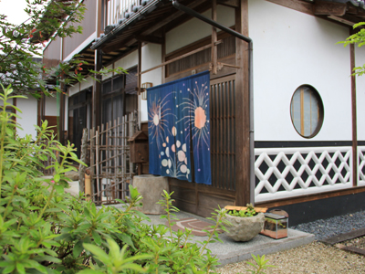 Bright fireworks burst over the blue ground on this noren. Their last noren also featured a fireworks design, and it was so popular that they requested a similar design for this one. Colorful bursts of fireworks fill the night sky. This noren can be found a little off the main road because it hangs near the family's garden, which is open to visitors. During Katsuyama's annual Hina Doll Festival, The family puts out a display of dolls to welcome guests to their garden. They are active members of the Katsuyama Townscape Support Association. |