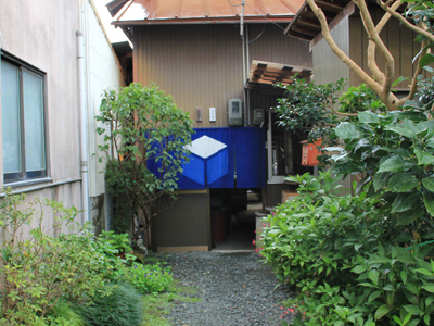 The family made tofu until a few years ago, so their noren has a navy blue background with a single square of white tofu on it. Their first noren was made of linen cloth, but when the actor Fumiyo Watanabe visited Katsuyama several years ago for a television broadcast, he said, "If you use momen (cotton) for your noren, that tofu will be momendofu." (Momendofu is one of the varieties of tofu.) The family has used cotton for its noren ever since. This is their third noren with a tofu design, and it waves over a doorway slightly off the main street. |