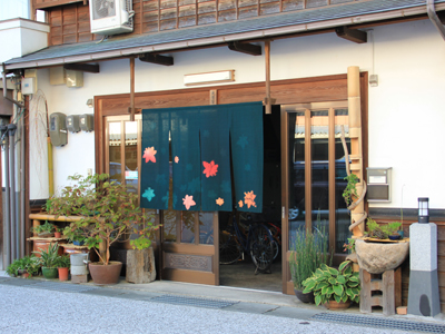 their number was reduced after speaking with Yoko Kano. The silhouettes of those missing leaves are still visible, and give the impression of a deep cover of leaves. Their first noren has a design based on the family's favorite green bamboo. They put out a carved bamboo display during the