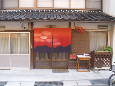 This noren has the image of Katsuyama at dusk. The individual clouds floating above the mountain silhouette were each created using a different dyeing method. Their previous noren has an image of the Asahi River in summertime. Each summer, the river is full of ayu fishermen, often including Mr. Okada. During ayu fishing season, the family changes to their Asahi River noren. Mrs. Okada works for the Katsuyama Sightseeing Association at the local train station. She can feel the changing seasons in the wind as she walks to work down the street full of noren. |