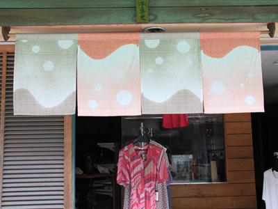 This family operated a kimono fabric shop in the old days. Their first noren's design comes from a kimono pattern. The gentle pink image of their second noren was suggested by their daughter. The design represents twinkling stars in the night sky and sparkling fish in the sea. The family feels as though the noren stimulate the minds of the people living in town and interest has increased along with the number of noren waving in the breeze. |