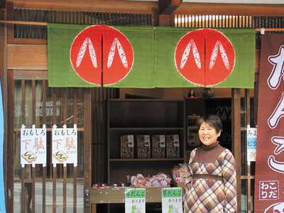 Sugi Footwear and Souvenirs opened around 1947 as a specialty footwear shop. In those days, they handled everything from shoes to traditional sandals made of wood or straw. Now, it's been renewed as a souvenir and footwear shop. It's one of the only places you can buy Kanba Falls Rice Crackers. The noren that hangs in front of this shop features a pair of vivid red wooden sandals set.Until now, their noren has featured the image of a pair of wooden sandals on a garden stone. Their current design represents the traditional footwear on a background of green grass. They have another large noren with a wooden sandal design over their door at home.