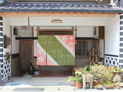 This noren's design is based on the river at this time of the year. They also have a noren with a Nakao family crest design. Mrs. Nakao is very talented at chirimen-zaiku (crepe crafts) and puts out displays of home-made dolls during the annual Hina Doll Festival. The family believes that each house has its own unique noren or display of Hina Dolls. This is a good example of the warm welcome at the heart of Katsuyama. |