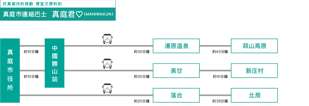 | 真庭市連絡巴士 真庭君(MANIWAKUN)♡ | 真庭市生活環境部居住安全課 | TEL.+81-867-42-1017 |