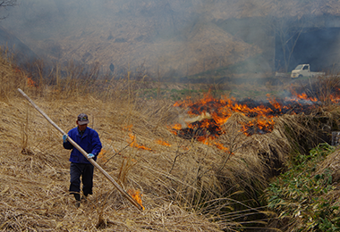 燒山作業具有長遠的歷史,是與山草共生所習得的一種智慧。為了保護草原以作為田地肥料及牛馬飼料,因此於春季融雪時進行燒山作業。也能藉此保護貴重的動植物。
