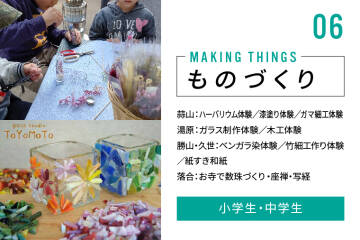 真庭の中でもその地域ならではの、モノづくりが生まれ、今なお、その技術を受け継ぎ、伝統工芸品として後世に伝える職人がいます。ものづくりは一緒に体験することで、大変さや楽しさ、モノへの愛着と大切さを学ばせてくれます。エリアごとに体験できるものづ...