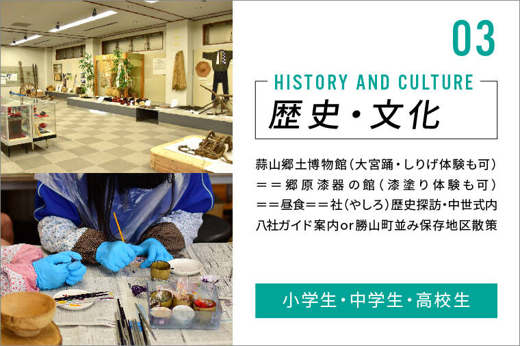 大規模な火山活動から蒜山高原のシンボル「蒜山三座」が誕生し、今から100万年前まで蒜山は湖でした。その後の火山活動から川の流れが変わり、この地に人々が暮らし始め、真庭各地のお祭り、風習などの文化が生まれました。岡山県北の発展、地方ならではの独特な習わしなどを歴史をふまえ学んでいただくコースです。