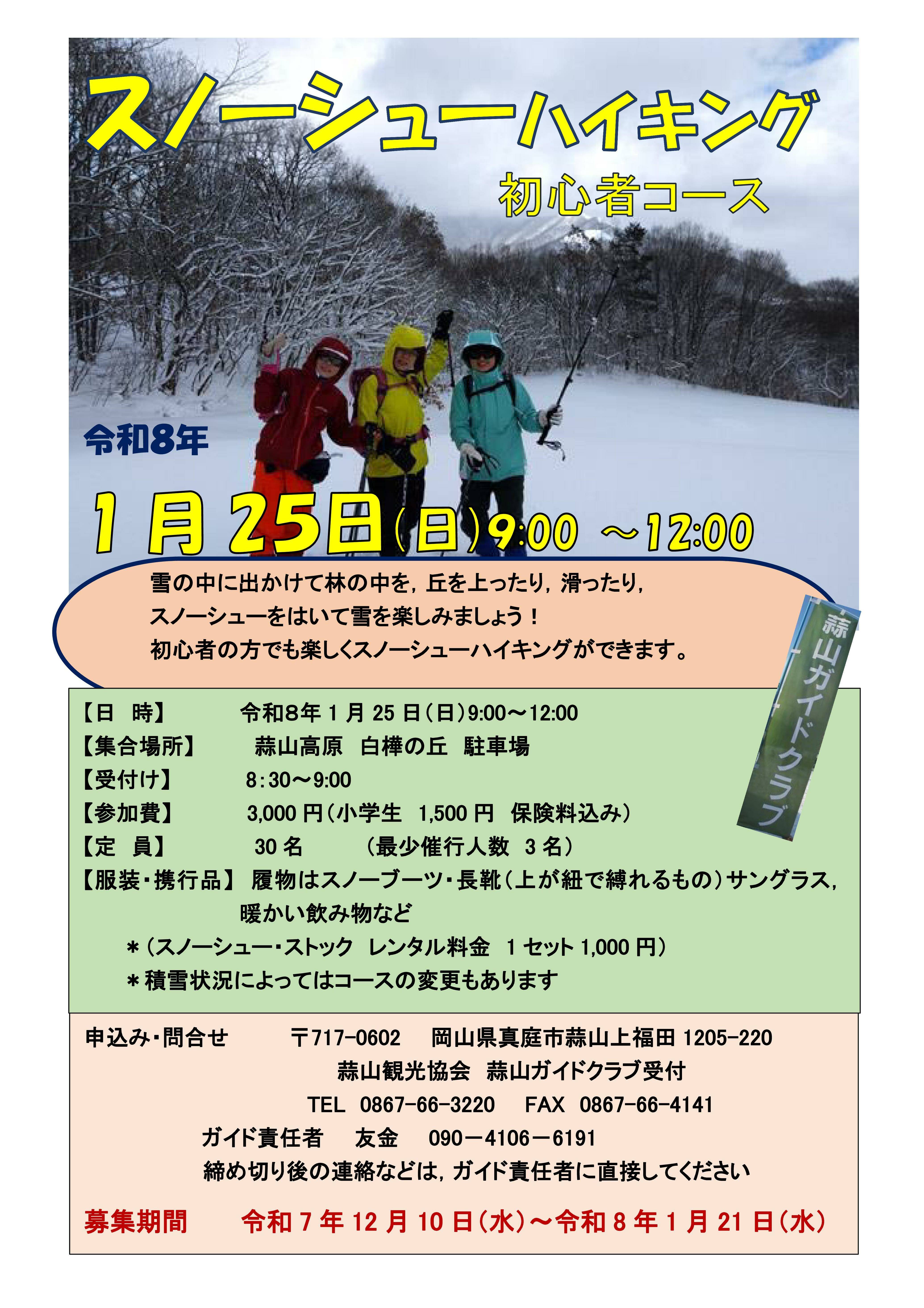 ・服装等:スノーブーツor長靴(上が縛れる物)、防寒服、帽子、手袋、サングラス、温かい飲みもの等