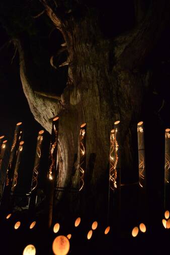 ここは大河ドラマ「武蔵」ロケ地にもなった神社。中世式内八社の歴史と、千年杉と言われる「佐波良の大杉」が竹あかりで幻想的に浮かび上がります。