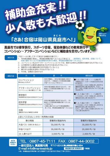 コンベンション、修学旅行、校外学習、合宿などを実施する団体または学校に対し、宿泊費および交通費の一部を補助します。