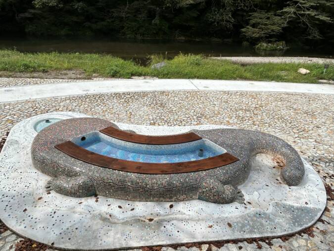 湯原温泉らしく形は“はんざき型”で、はんざきの背中に足湯があります。