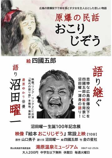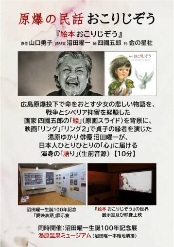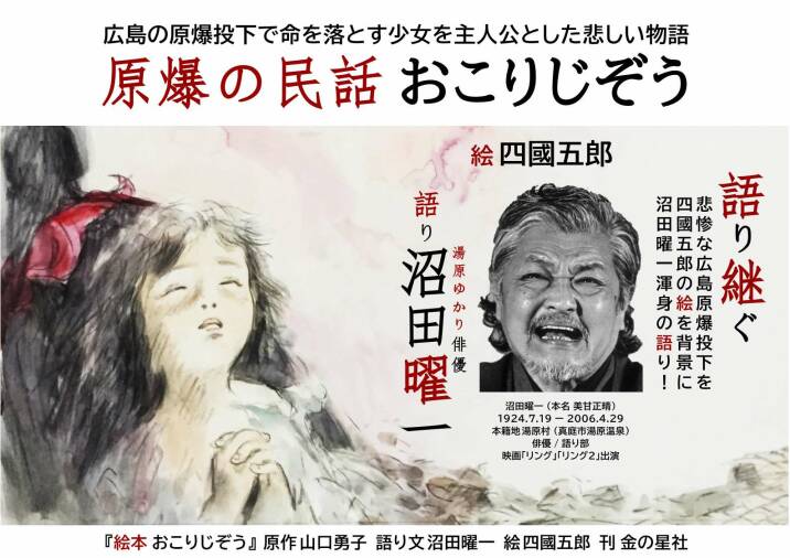 戦争とシベリア抑留の体験を持つ 画家 四國五郎 が「こわいものなど描きたくはないのだが、こわいものを地上から無くするためには描かねばならない。」との思いから描き上げた絵本の 「絵」 を背景(スライド)に、 俳優 沼田曜一 が、原作から自らの言葉で 「語り文」 を起こし、「私は、日本人の一人、一人の心の奥に、祈るような 思い をこめて、この話を語り続けてゆきたい」と鬼気迫る渾身の 「語り」 (生前肉声)が 映像 『絵本 おこりじぞう』(10分)として甦ります。