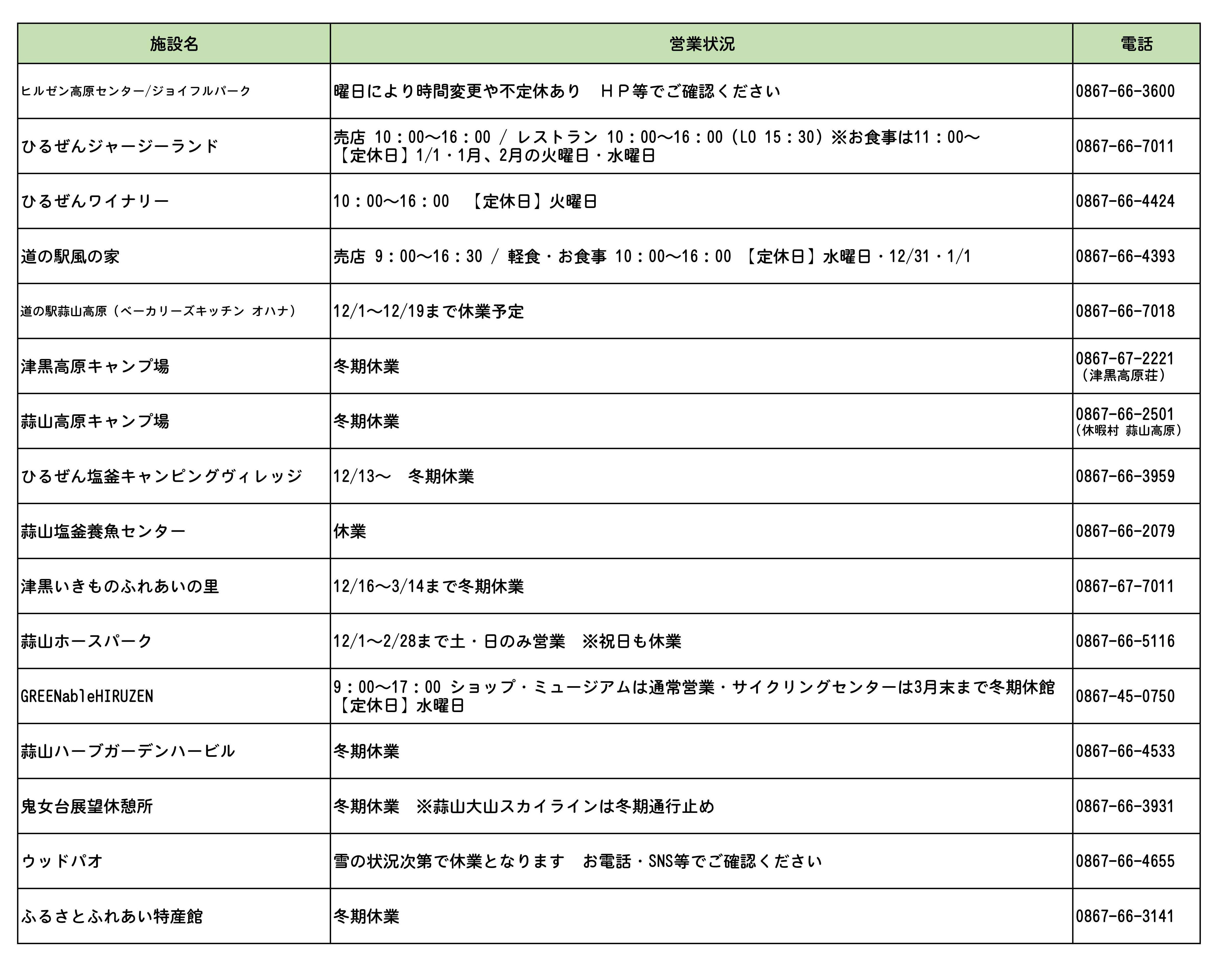 蒜山では、冬期休業や営業時間・定休日が変更となる施設があります。全ての施設ではありませんが冬期の営業状況を記載しています。なお、積雪状況や天候等により内容が変更になる場合がありますので、HP・SNS等でもご確認いただき、詳細につきましては各施設にお問合せください。