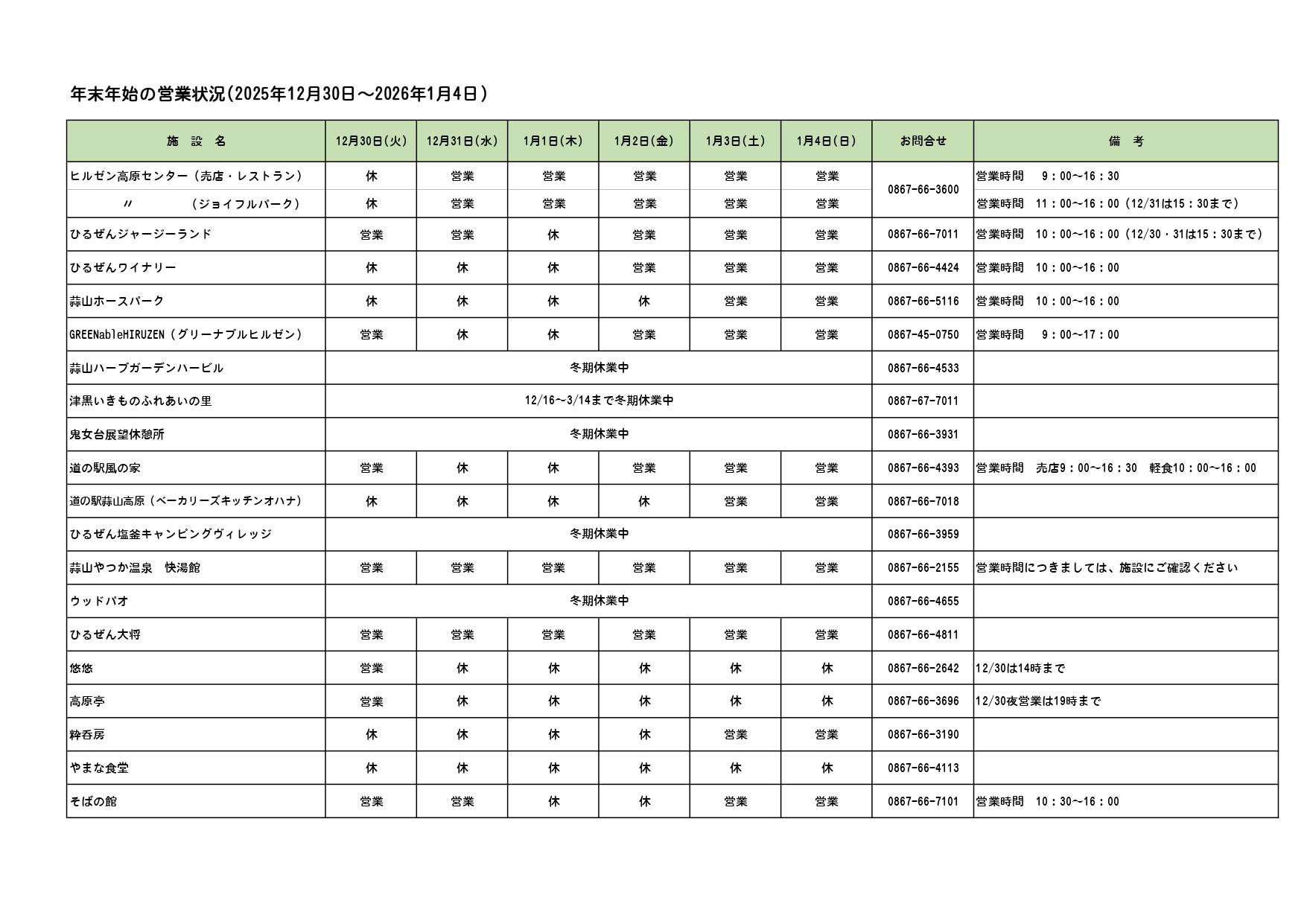 全ての施設ではありませんが、蒜山エリアの年末年始(12月30日~1月4日まで)の営業状況です。急遽、変更になる場合もあるかもしれませんので、詳細につきましては直接施設にご確認ください。よろしくお願いいたします。