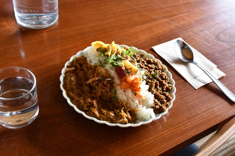 昼食は、再生デニムを手掛けるITONAMIが運営する、Café&ホテル「DENIM HOSTEL float」のスパイシーカレーです。