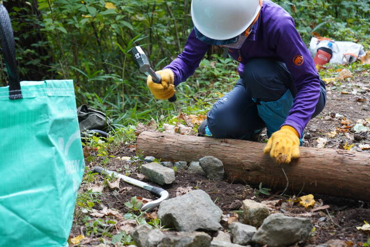 木・石・土を使い、雨水で土砂が流れないよう、登山者が歩くことによって地面が掘られないよう、設計しながら行います。