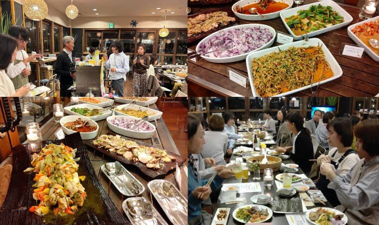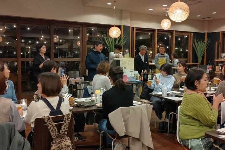 異業種クロスオーバー発酵チーム『まにわ発酵's』代表の河野酢味噌製造工場5代目 河野尚基さんや美作ビアワークスの三浦弘嗣さんと共に「まにわ発酵's×真庭あぐりガーデン」とのコラボ料理を堪能。