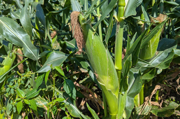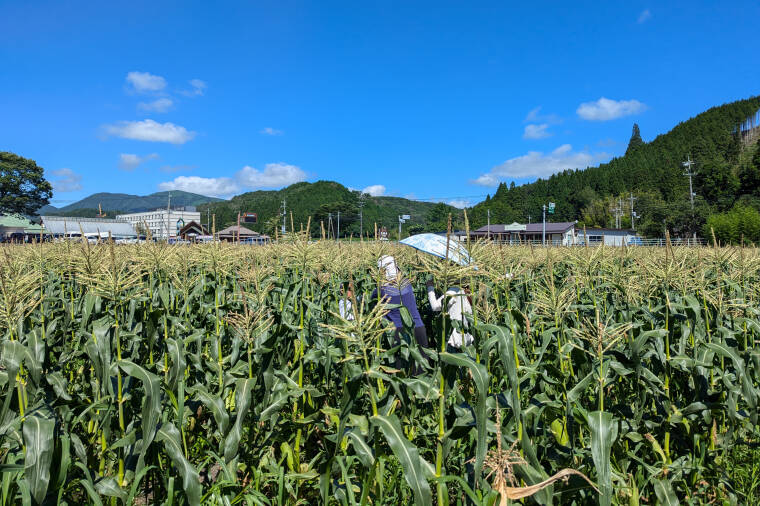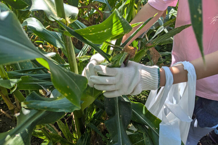 特徴や収穫方法をお聞きしたら、畑の中に入っていきます。大人の背丈よりもおおきなとうもろこし。まるで迷路のようです。