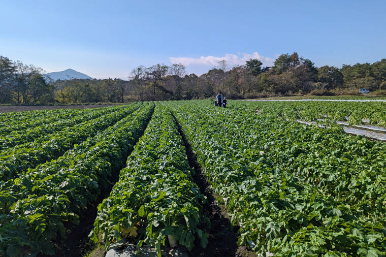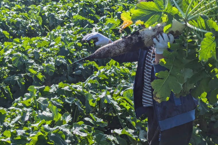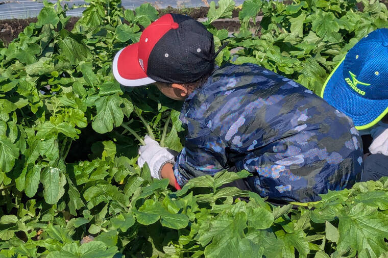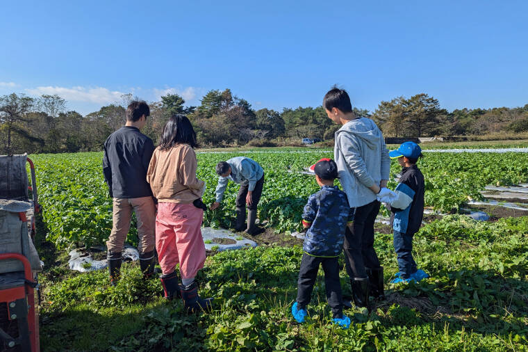 広大なだいこん畑の中で大きなだいこんを見つけます。足元は汚れやすいので、長靴も貸し出しております。