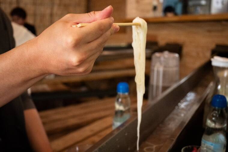 流しそうめんを注文すると、そうめん用の器と薬味、そうめんつゆが用意され、準備完了。「そうめん流していきますね〜」という店員さんの合図の後は、次々とそうめんが流れてきます。