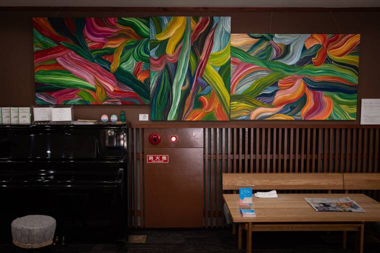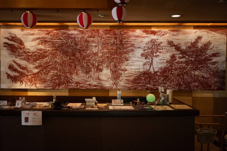 八景には山部 泰司さんの絵画が展示されています。フロントに展示されている絵画は大迫力!ロビーやラウンジなどの共有スペースには過去の芸術温度の際に描かれた作品も飾られています。