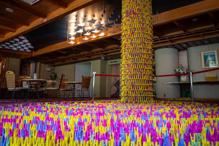 菊之湯には高本 敦基さんの洗濯バサミでできた塔がロビーのど真ん中に!!