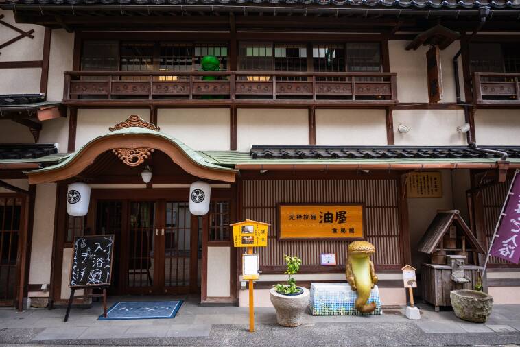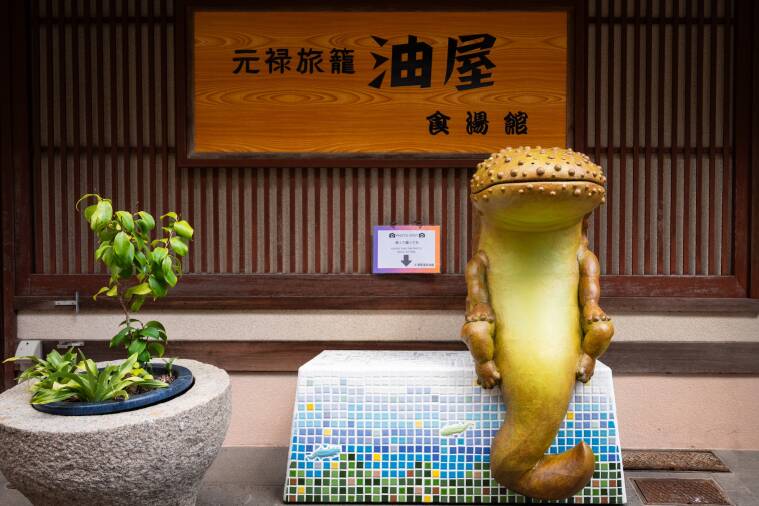 油屋には、カラフルなタイルが貼られた台に腰掛けるはんざき(オオサンショウウオ)の像が登場。新たなフォトスポットになる気配がビンビンです(笑)
