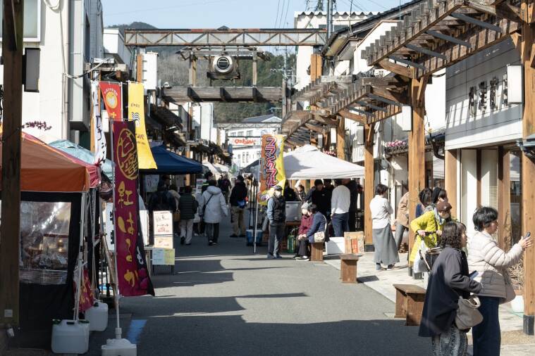 まずは、中国勝山駅と「勝山の町並み保存地区」の間にある「新町商店街」で2月28日(土)と3月1日(日)の週末のみ開催されていた「しんまち ひなマルシェ」へ。
