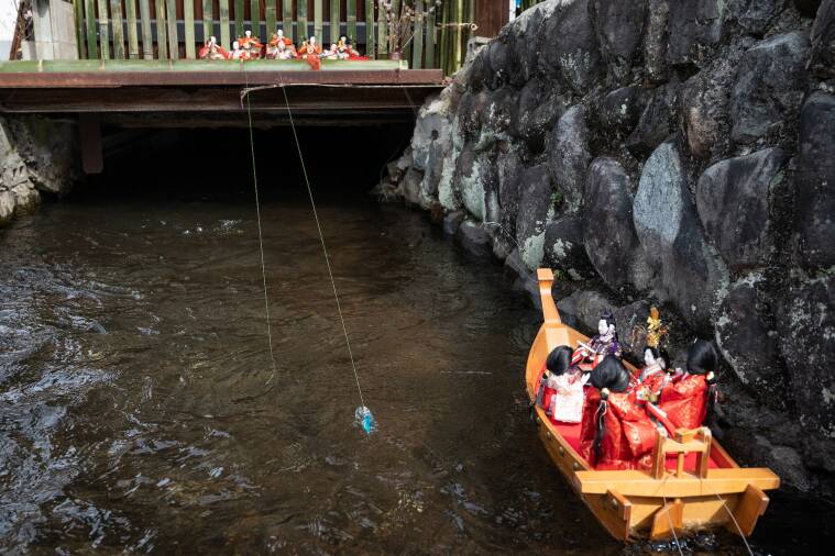 「勝山の町並み保存地区」では通り沿いの軒先やお店の中、さらには小川の上にまでひな人形が!